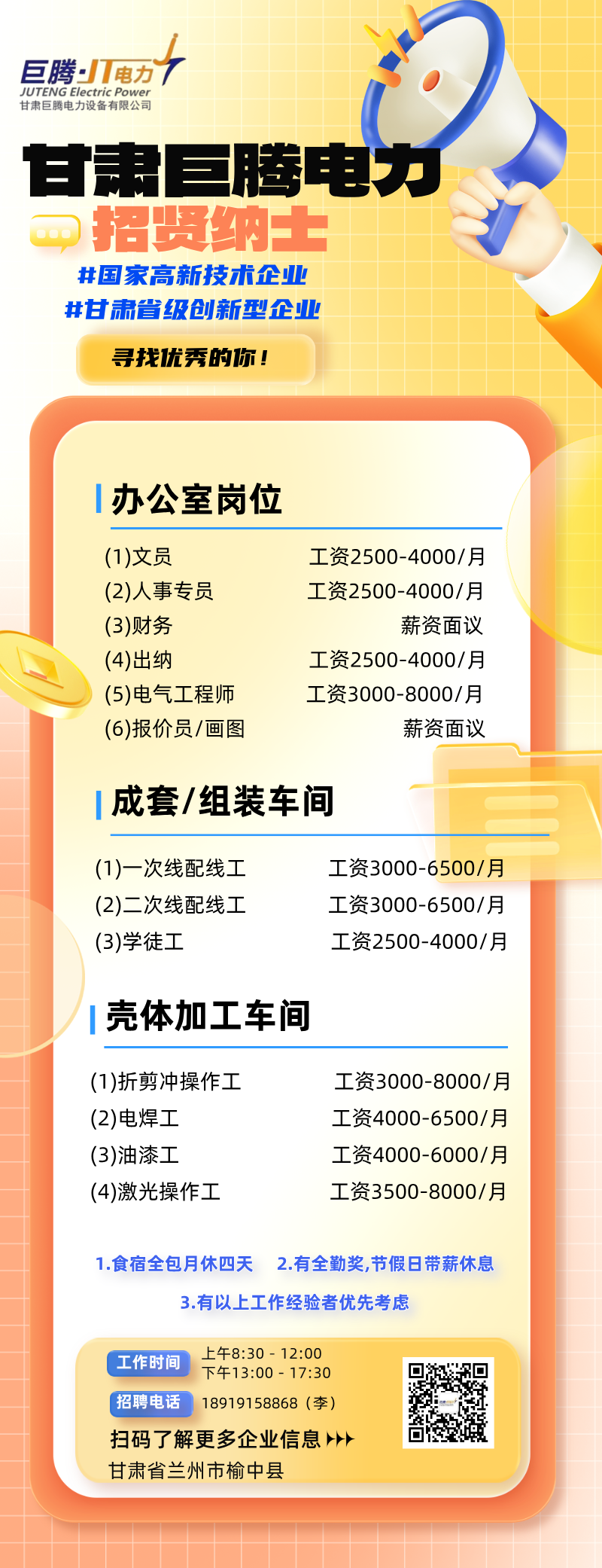 甘肃巨腾电力,作为行业内的翘楚,现正积极拓展业务版图,诚邀有志之士加入我们的团队。对于办公室岗位,我们寻找具备沟通能力和组织协调能力的人才,以确保日常运营的顺畅。成套组装车间与壳体加工车间则需要熟练的技术工人和质量检验员,要求对电力设备组装工艺及安全标准了如指掌。我们提供具有竞争力的薪酬福利、良好的职业发展空间以及舒适的工作环境。期待您的加盟,共同创造辉煌未来!